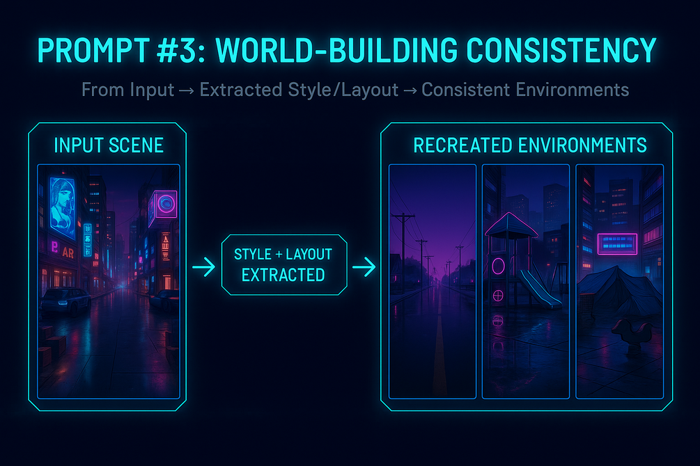 A 3-prompt AI toolkit that keeps your characters and environments visually consistent across ChatGPT, Claude, Gemini, and more.